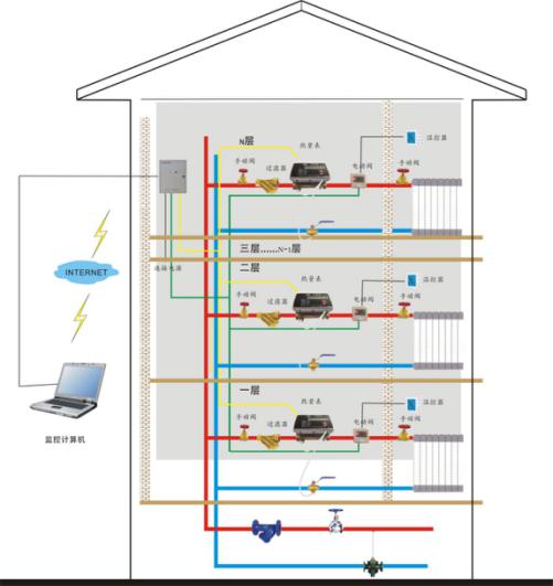 超聲波熱量表串接在進(jìn)戶管道上,配對的溫度傳感器分別接入進(jìn)水管和回水管,其流量計測出的流量數(shù)據(jù)、溫度傳感器測出的進(jìn)水和回水溫度,由積算儀根據(jù)相應(yīng)公式計算出耗熱量進(jìn)行計費,智能溫控閥串接在進(jìn)戶管道上,根據(jù)監(jiān)控中心的指令進(jìn)行閥門開、關(guān)操作,進(jìn)而控制用戶的用熱情況。